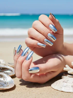 Chrome nails shine like smooth metal under the sun. They look bold, cool, and super eye-catching — perfect for making a summer statement.