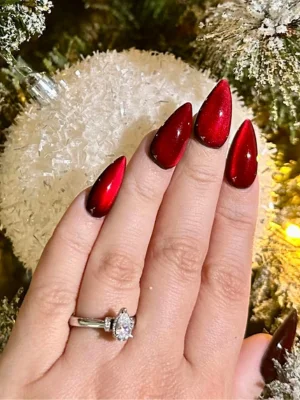 Fiery red Cat eye nails catch the light with every move. They create a glowing stripe that feels daring and glamorous. The shimmer gives depth to the classic red manicure. It stands out in sunlight or city lights. Perfect for anyone who loves nails that speak confidence.