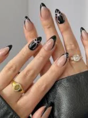 Edgy black French tips with delicate floral details create a bold look. This floral French tip nail is dramatic and fashion-forward. π€πΈ