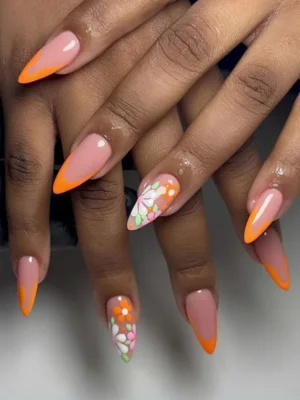 Bright pink and orange French tips with tiny blooms create a lively manicure. This floral French tip nail bursts with colour and personality. ππ§‘