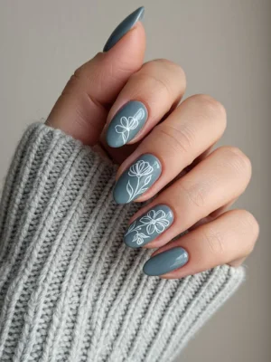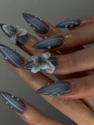 Sculpted floral grey nails bring tiny flower details to life. The 3D petals pop against the grey base, making the design feel delicate and artsy.