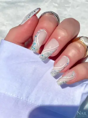 Gray nails with glitter and swirls feel playful and stylish. The mix makes each nail fun and unique.