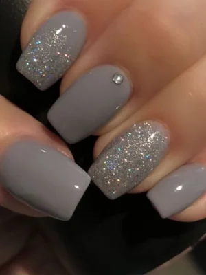 Gray glitter nails sparkle just enough to catch the light. They feel fun, magical, and a little festive.