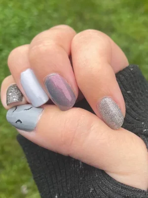 Skittle gray nails mix different shades on each nail for a playful, fun look. Each finger feels unique and colorful without being too bright.