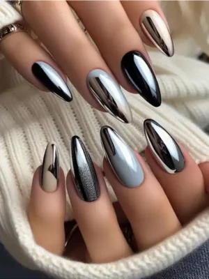 Black and gray nails mix darkness and neutrality for a dramatic, modern effect. Theyβre perfect if you like bold style with balance.