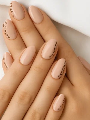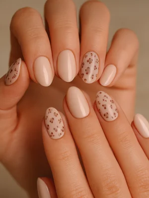 Soft creamy nude nails with tiny leopard spots give a sweet, calm, and super cute style. It’s gentle enough for everyday but still fun.